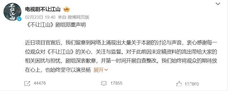 同日,杨洋工作室与《不让江山》剧组先后发布联合声明,